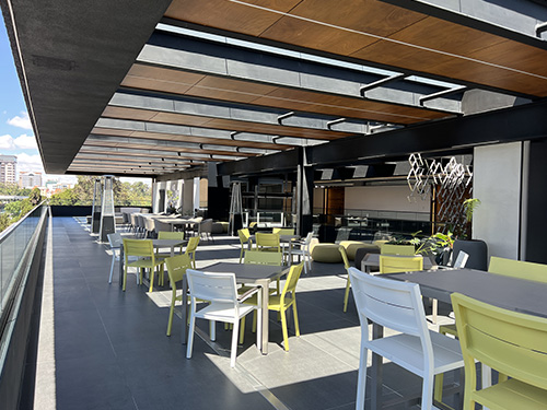 La Terraza del quinto nivel del edificio AEME es el lugar ideal para eventos corporativos y sociales. Esta es una locación dinámica para quienes desean un espacio distintivo y personalizable. Con un área rectangular de 275 m2, la Terraza ofrece un entorno versátil y vibrante. Los tragaluces permiten que la iluminación y la energía fluyan por todo el espacio. La vista diurna o nocturna a la cuidad es impresionante e ininterrumpida. El interior da hacia el atrio del edificio, ofreciendo así un telón de fondo perfecto para espléndidos acontecimientos y ocasiones especiales.