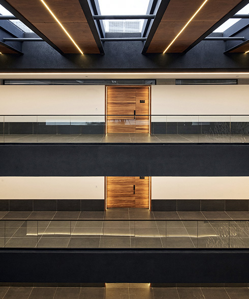 AEME ofrece catorce oficinas exclusivamente en arrendamiento, éstas están distribuidas entre los niveles 3 al 5 cuyo acceso es por medio de dos ascensores panorámicos o el módulo de gradas escultóricas. La recepción para visitantes se ubica en el piso 2. Los amplios pasillos dan vista al atrio permitiendo la ventilación cruzada. Áreas desde 98 m2, todas las oficinas cuentan con dos baños privados, iluminación natural y manejadora de aire acondicionado VRF.